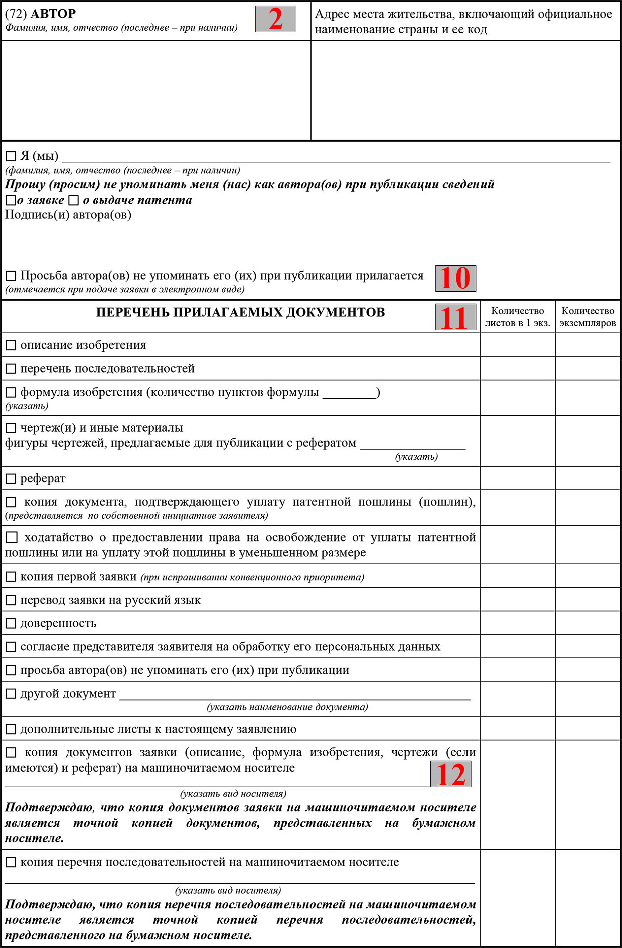 - Учтите, что не всегда автор изобретения желает разглашать о себе информацию. Если это так, то поставьте галочку в соответствующей клетке и заверьте подписью автора (10).